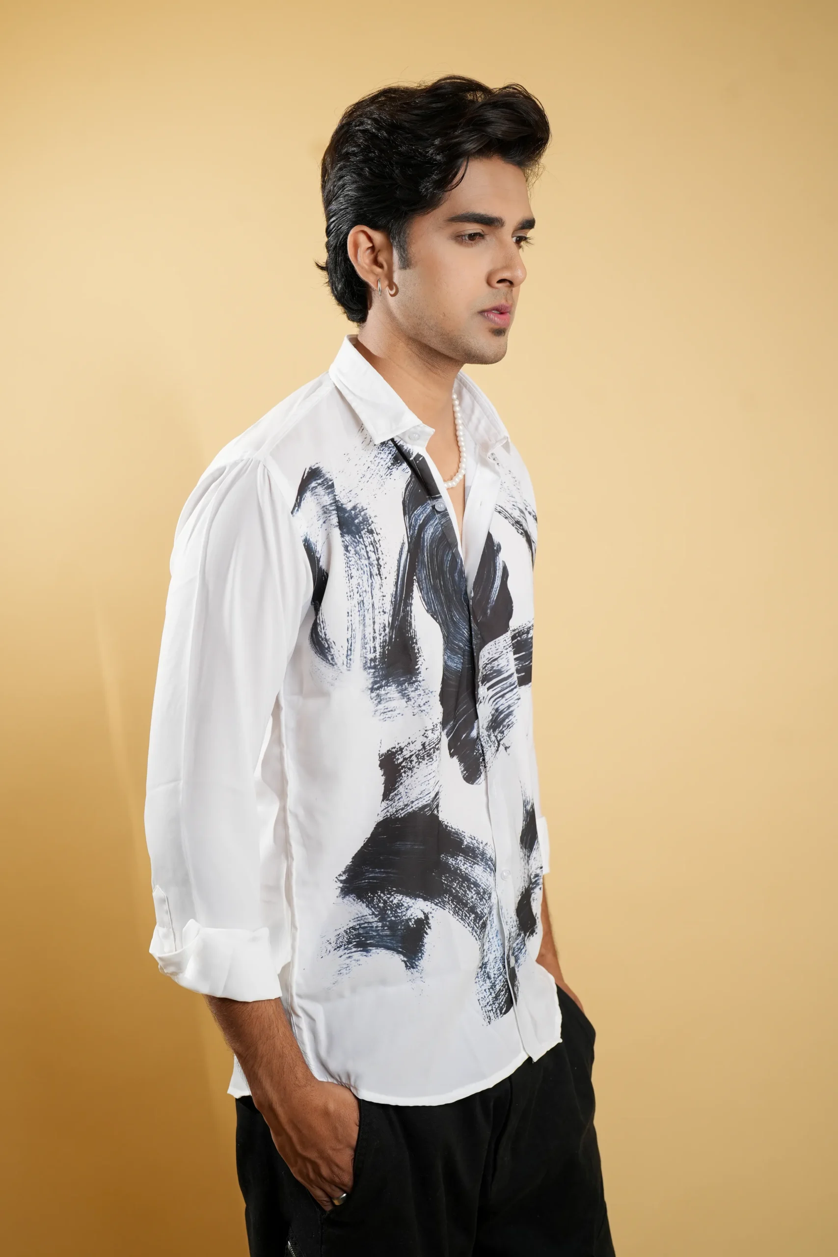 This shirt showcases a bold abstract brushstroke print on a crisp white base, inspired by modern art aesthetics. Abstract prints are widely recognized in contemporary menswear for adding personality and statement appeal without relying on heavy colors.