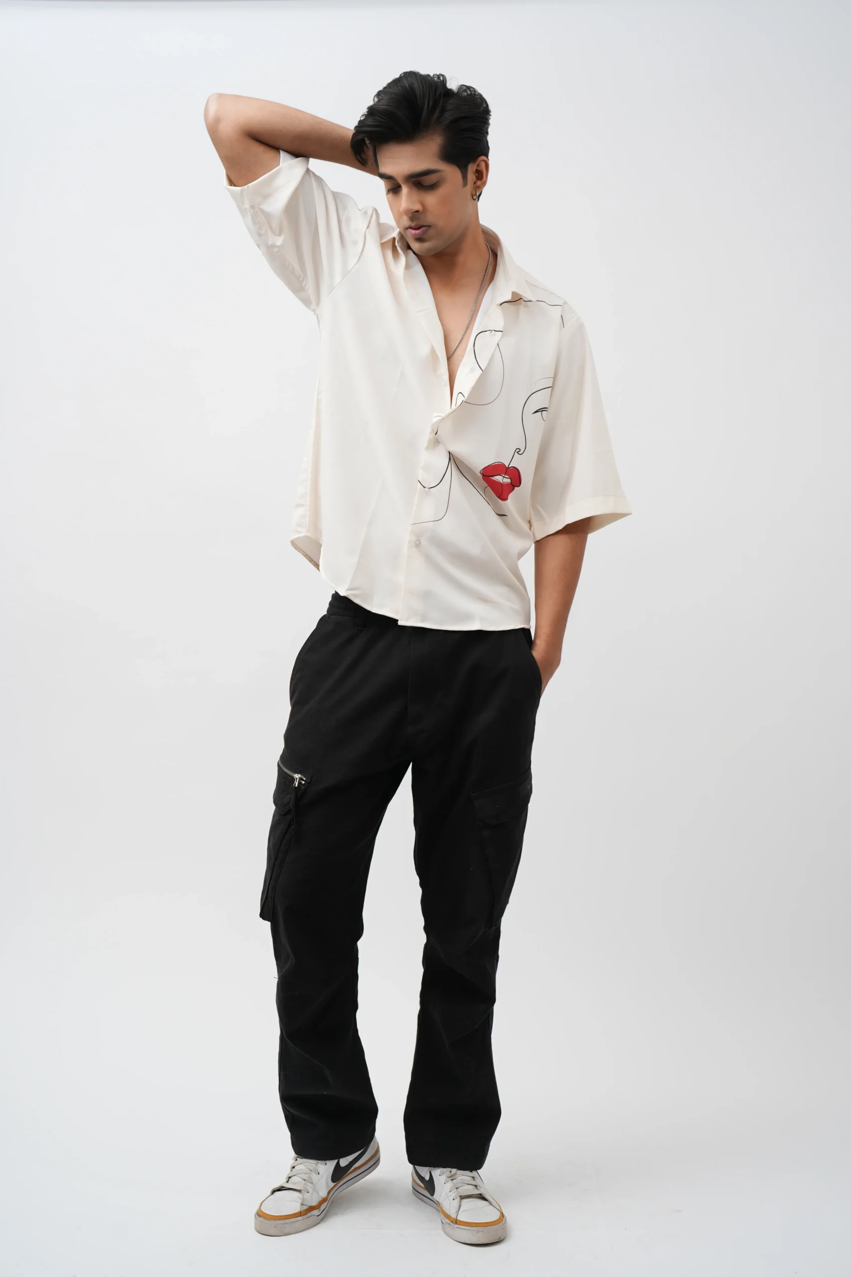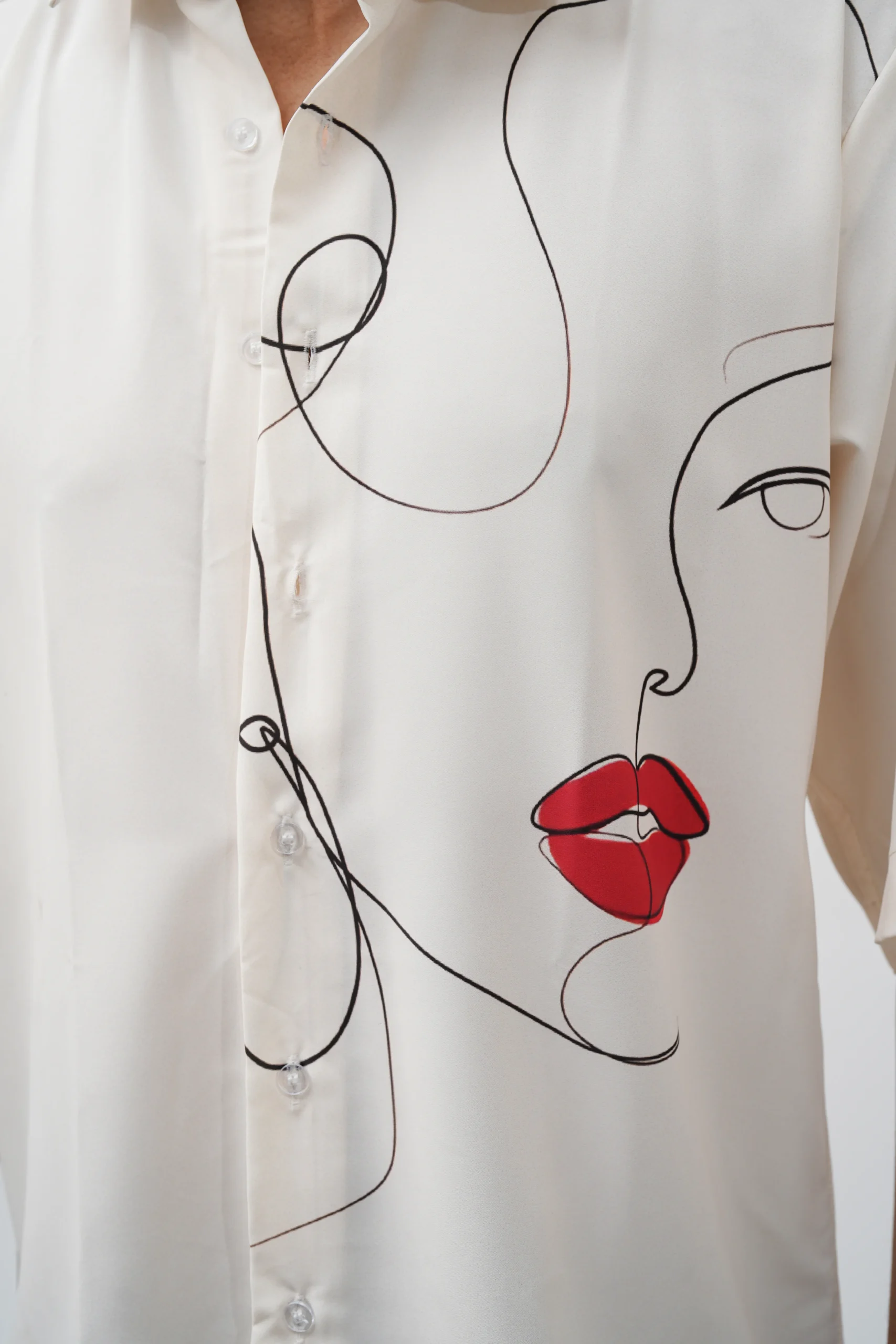 This shirt features a unique abstract line art face graphic with a bold red lip accent on a premium off-white base. The minimalist yet striking artistic design creates a high-end designer look, making it an ideal choice for men who want a sophisticated, modern aesthetic for vacations, brunch dates, or creative events.