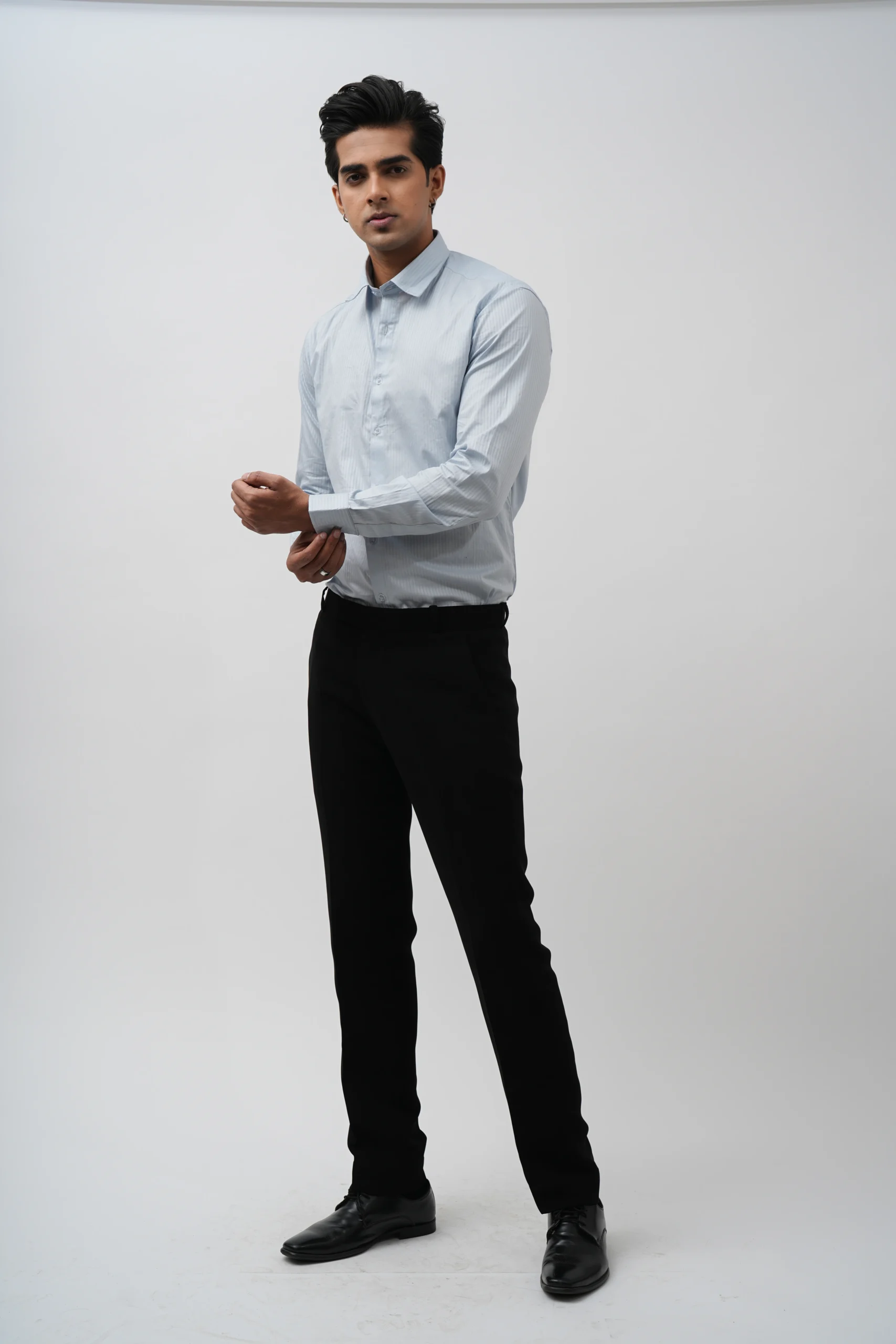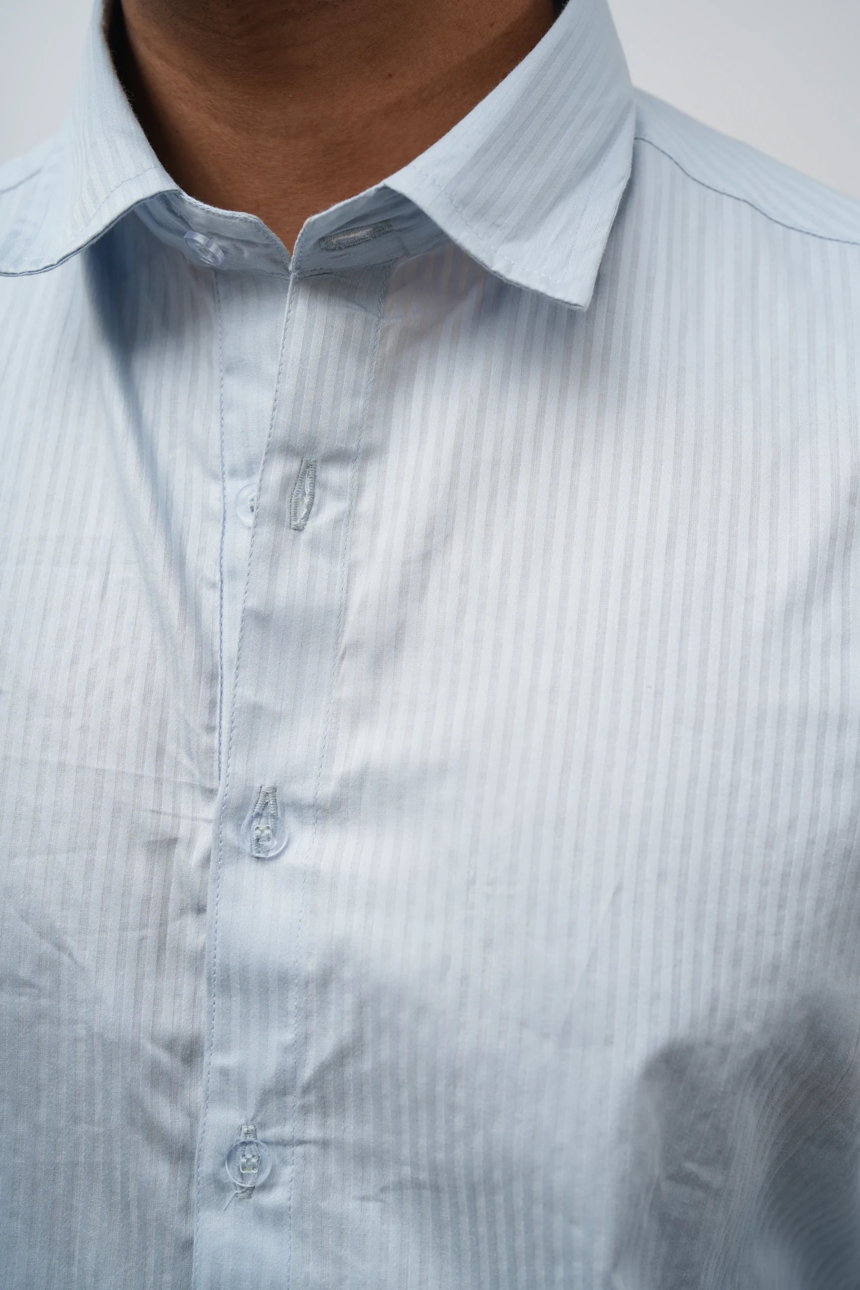 This shirt features a subtle self-striped texture woven directly into the fabric, giving it a refined and elegant appearance without bold prints. Such tonal stripe weaves are commonly used in premium formal and semi-formal shirts to add depth while maintaining a clean, professional look.