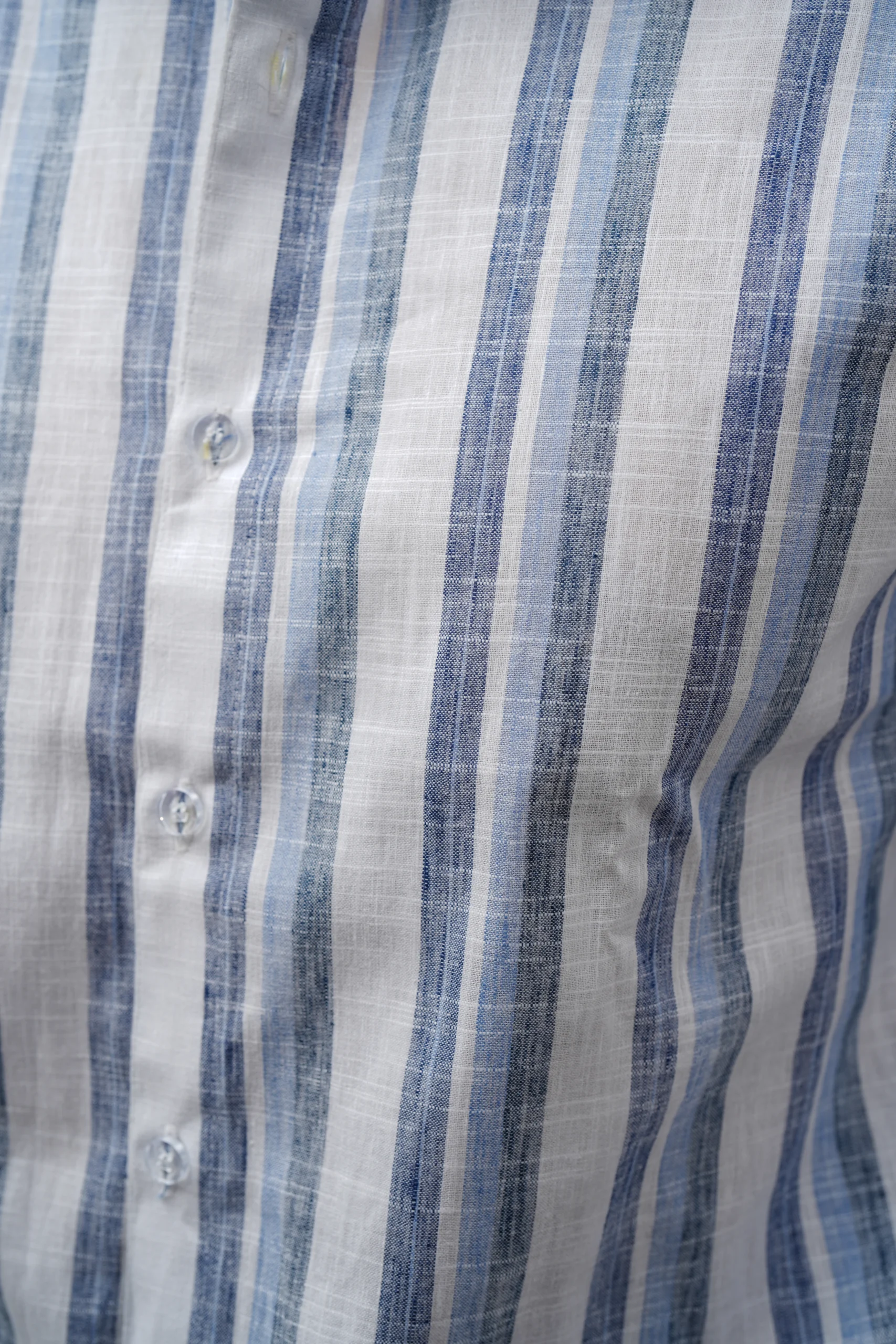 This shirt is a long-sleeve, button-up shirt featuring vertical stripe patterns in soft, muted tones. Vertical stripes are a timeless design element in menswear, widely used for their clean appearance and ability to create a visually elongated silhouette.