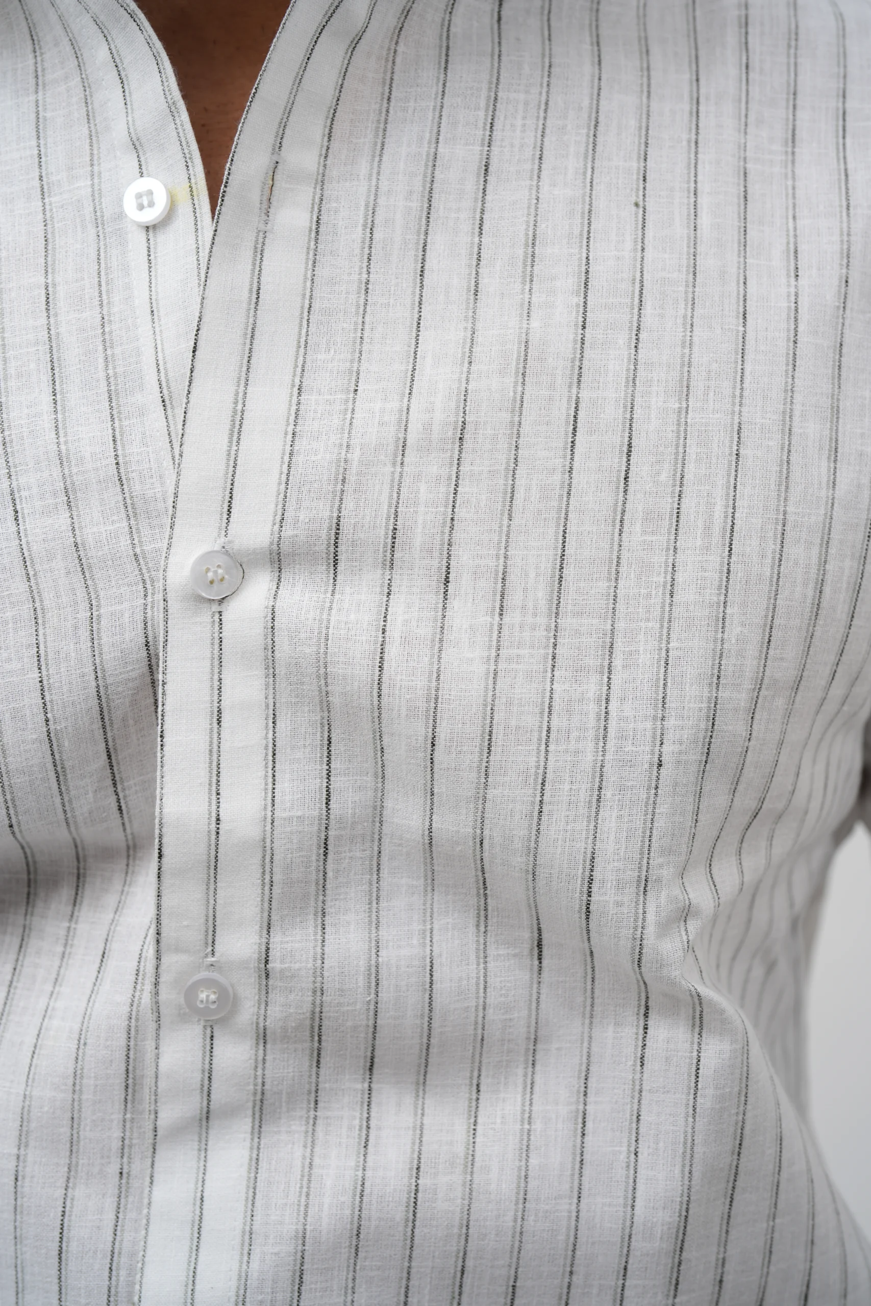 This shirt features a subtle vertical pinstripe pattern on a soft off-white base, creating a clean and refined look.