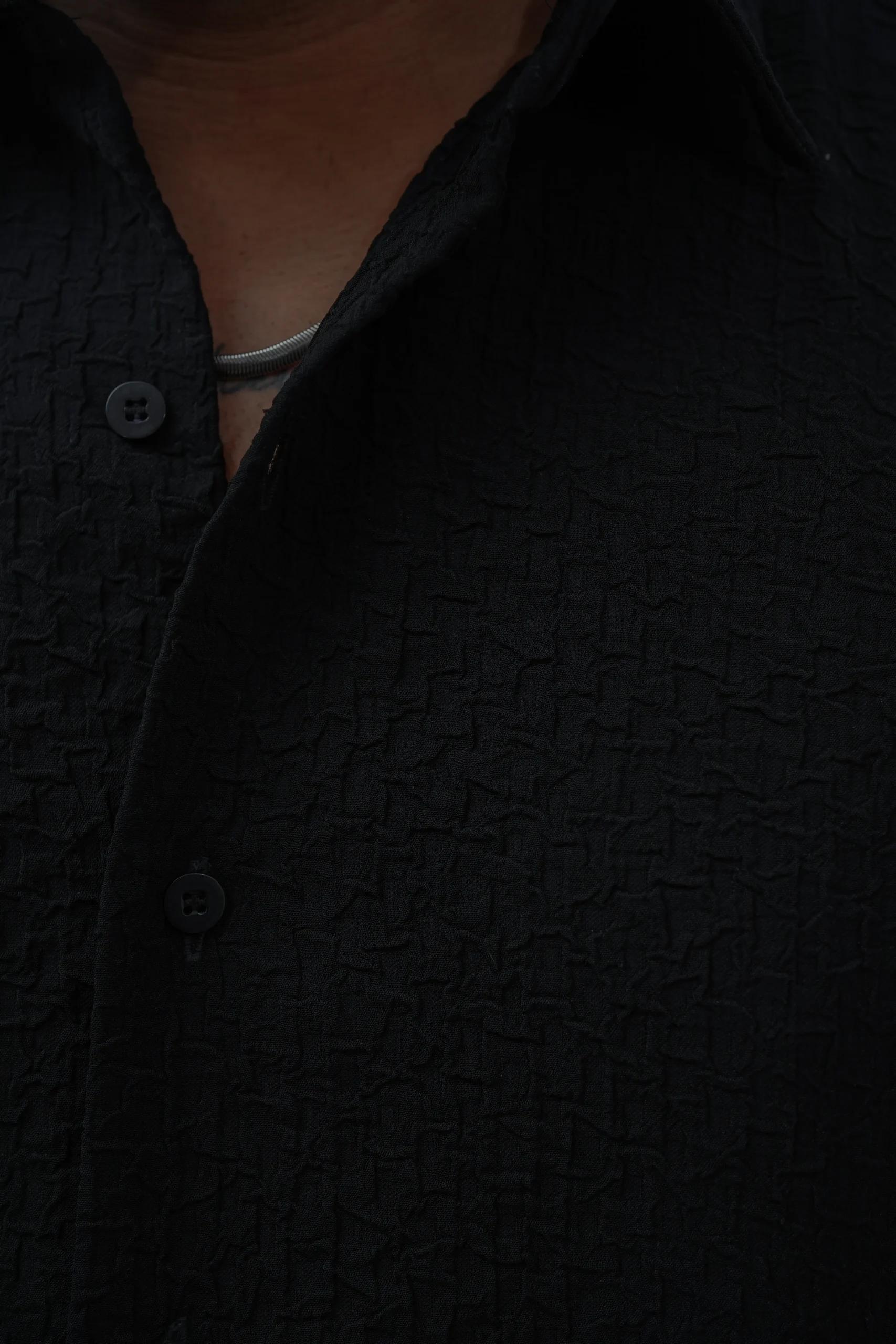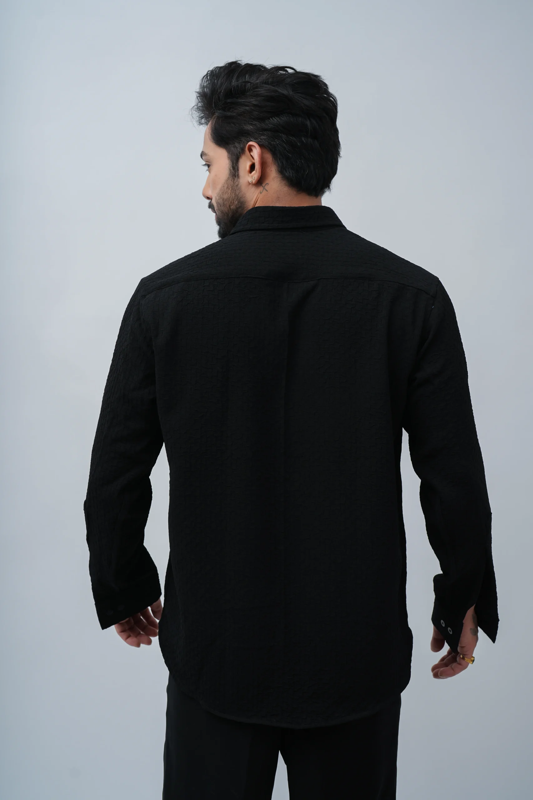 This shirt features an imported textured emboss fabric on a deep black base, giving it a refined and sophisticated appearance. Emboss textures are valued in menswear for adding subtle depth and dimension to solid garments, allowing the fabric itself to become the design highlight while maintaining a clean and minimal aesthetic.
