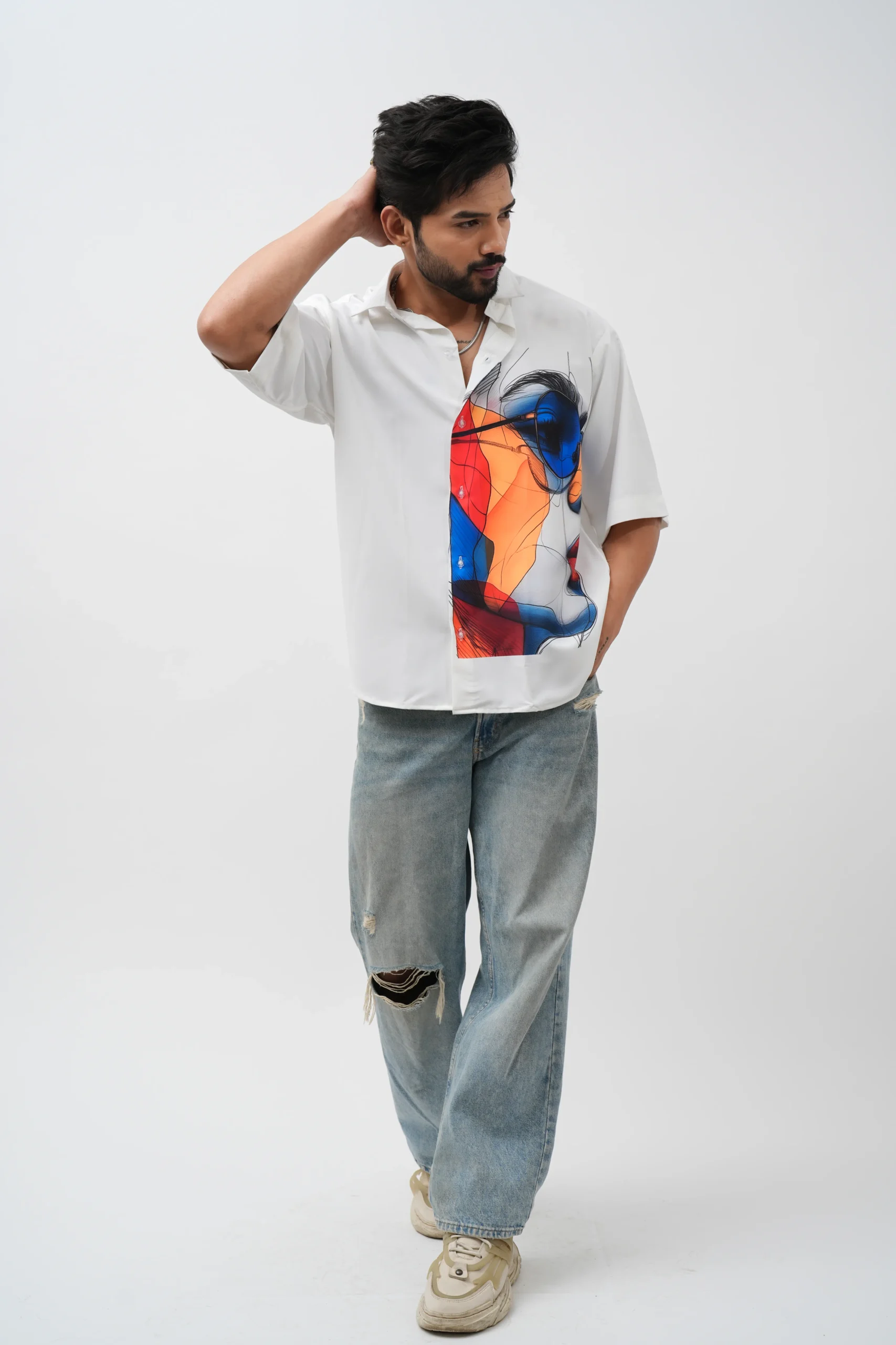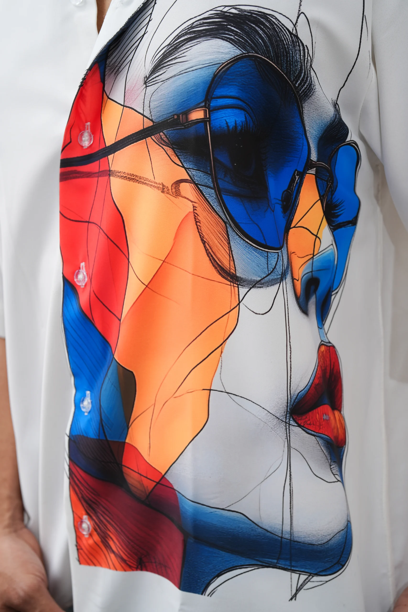 This shirt features a striking abstract face print panel on a clean white base, blending modern art with contemporary fashion. The vibrant mix of colors and artistic lines creates a bold visual statement, making it perfect for men who like standout and creative styles.