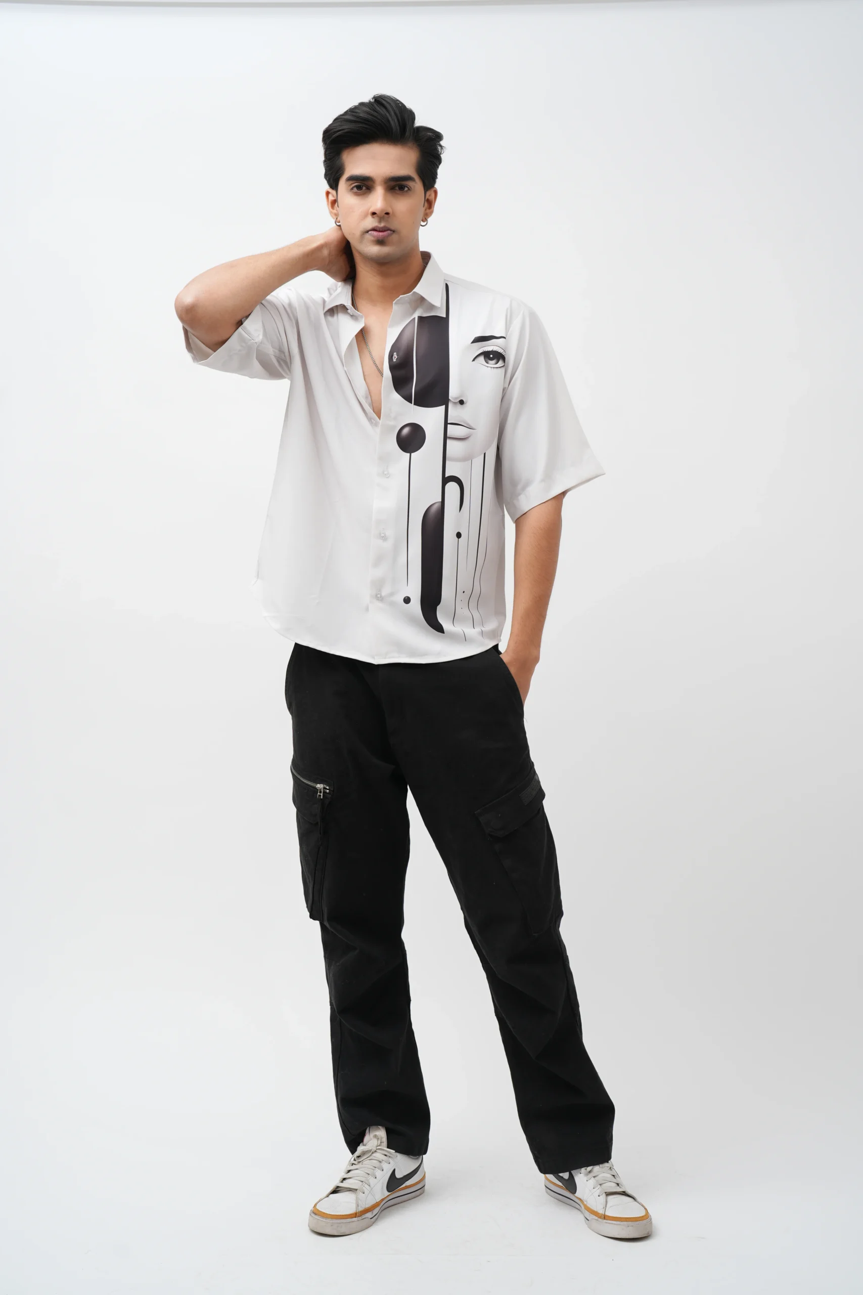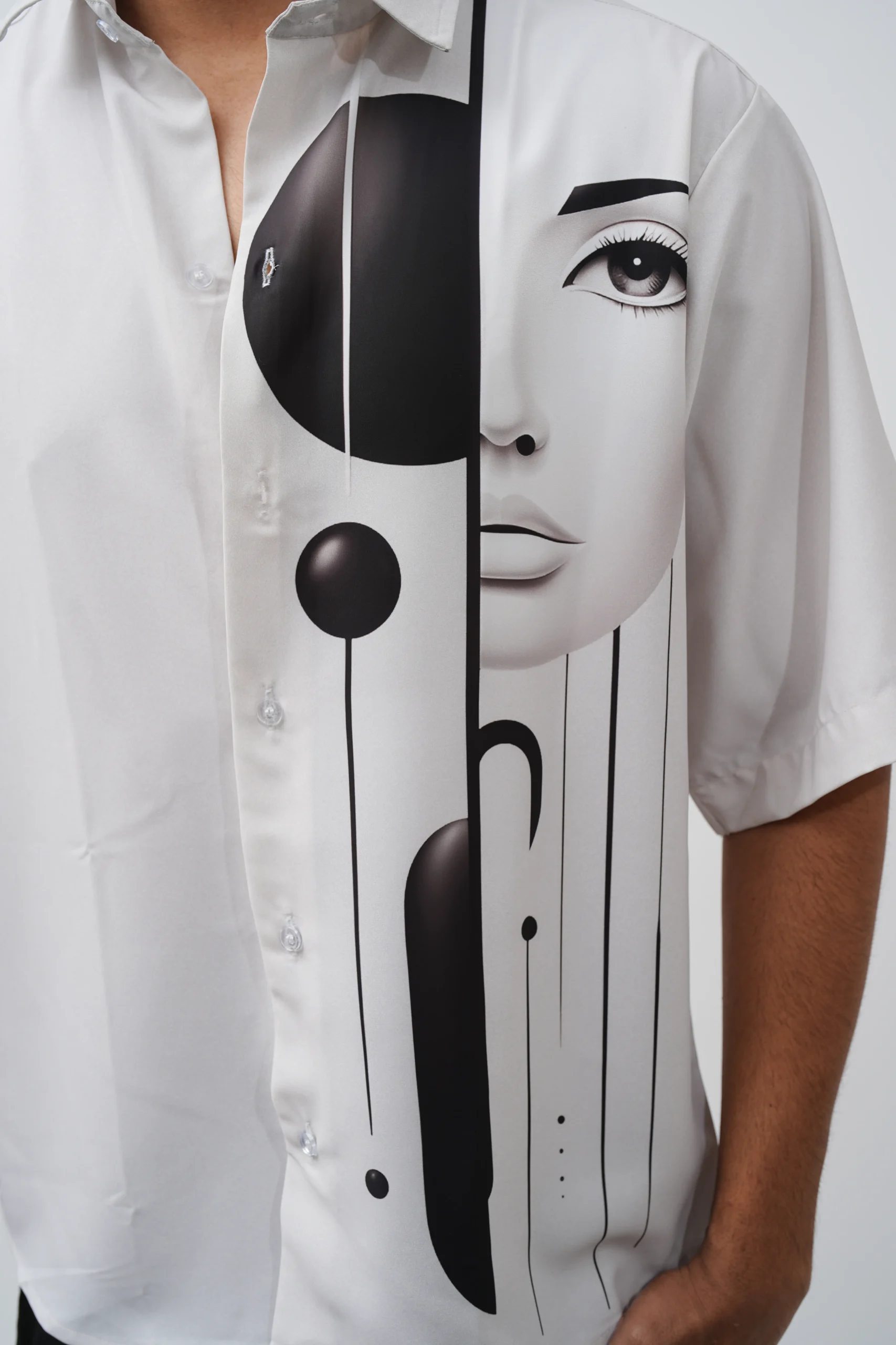 This shirt showcases a modern minimalist face art print placed vertically on a clean white base, creating a refined yet artistic statement. The monochrome design blends contemporary fashion with subtle creativity, making it perfect for men who prefer stylish but minimal prints.