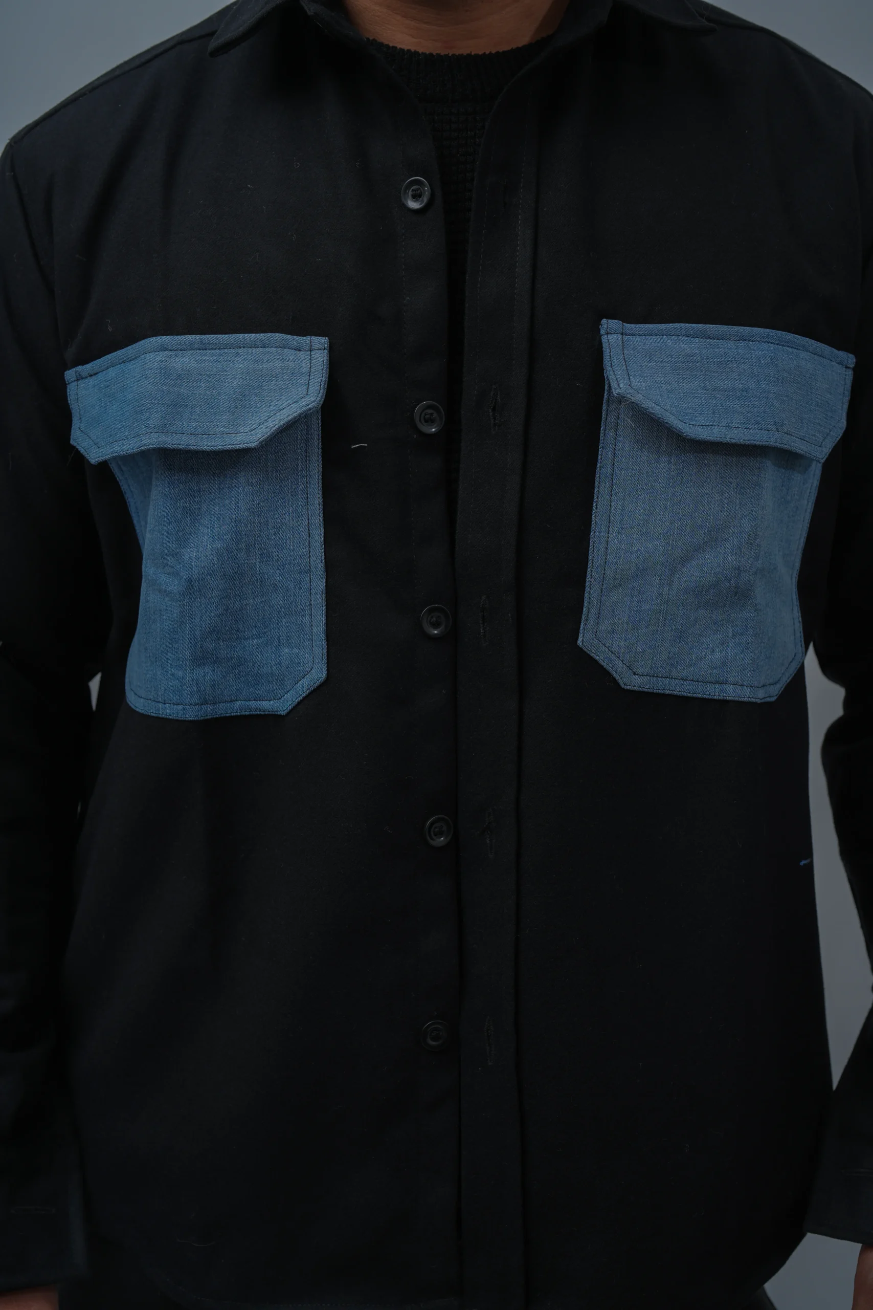 This wooly twill solid shacket features a structured silhouette with contrast denim-style utility pockets that add a bold modern touch. The textured twill fabric provides warmth and durability, making it an ideal layering piece for winter casual and street-inspired outfits.